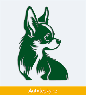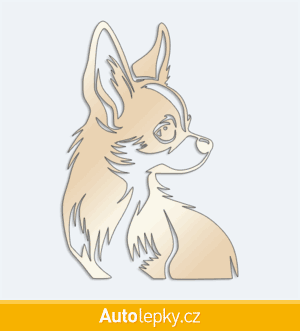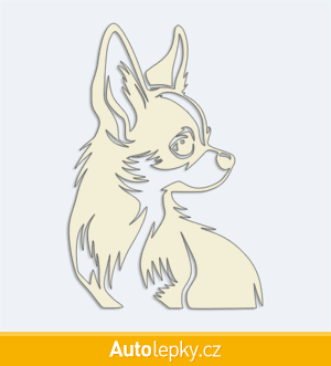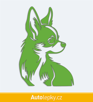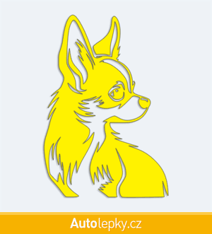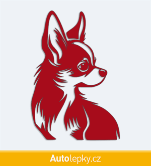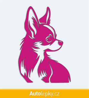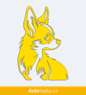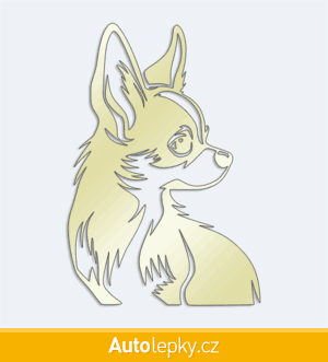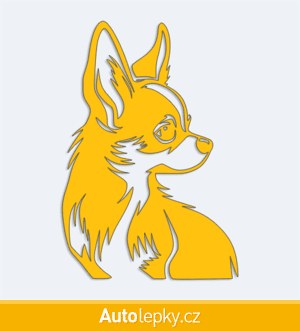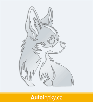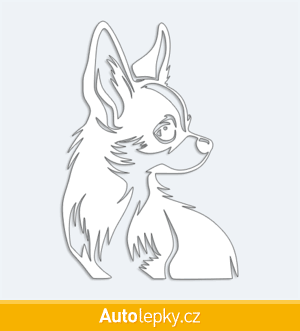 Nálepku čivava na auto vyrábíme ve 40 barvách a mnoha velikostech. Minimální rozměr samolepky je 8.2×12 cm, katalogové číslo 6031. Samolepka na auto čivava je vyrobena z kvalitní samolepicí fólie s životností 3-5 let.