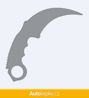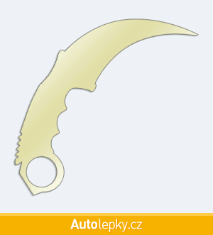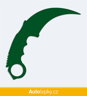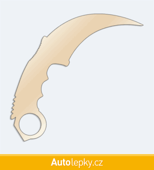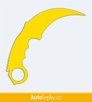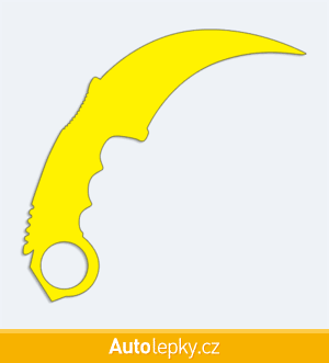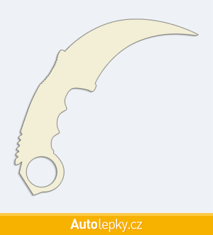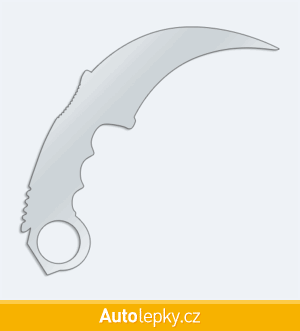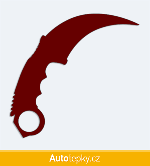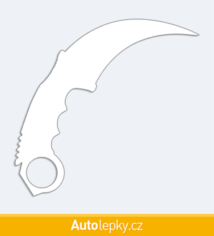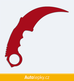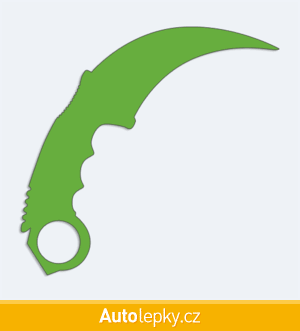 Nálepku karmabit na auto vyrábíme ve 40 barvách a mnoha velikostech. Minimální rozměr samolepky je 10×9.6 cm, katalogové číslo 6286. Samolepka nůž karmabit na auto je vyrobena z kvalitní samolepicí fólie s životností 3-5 let.